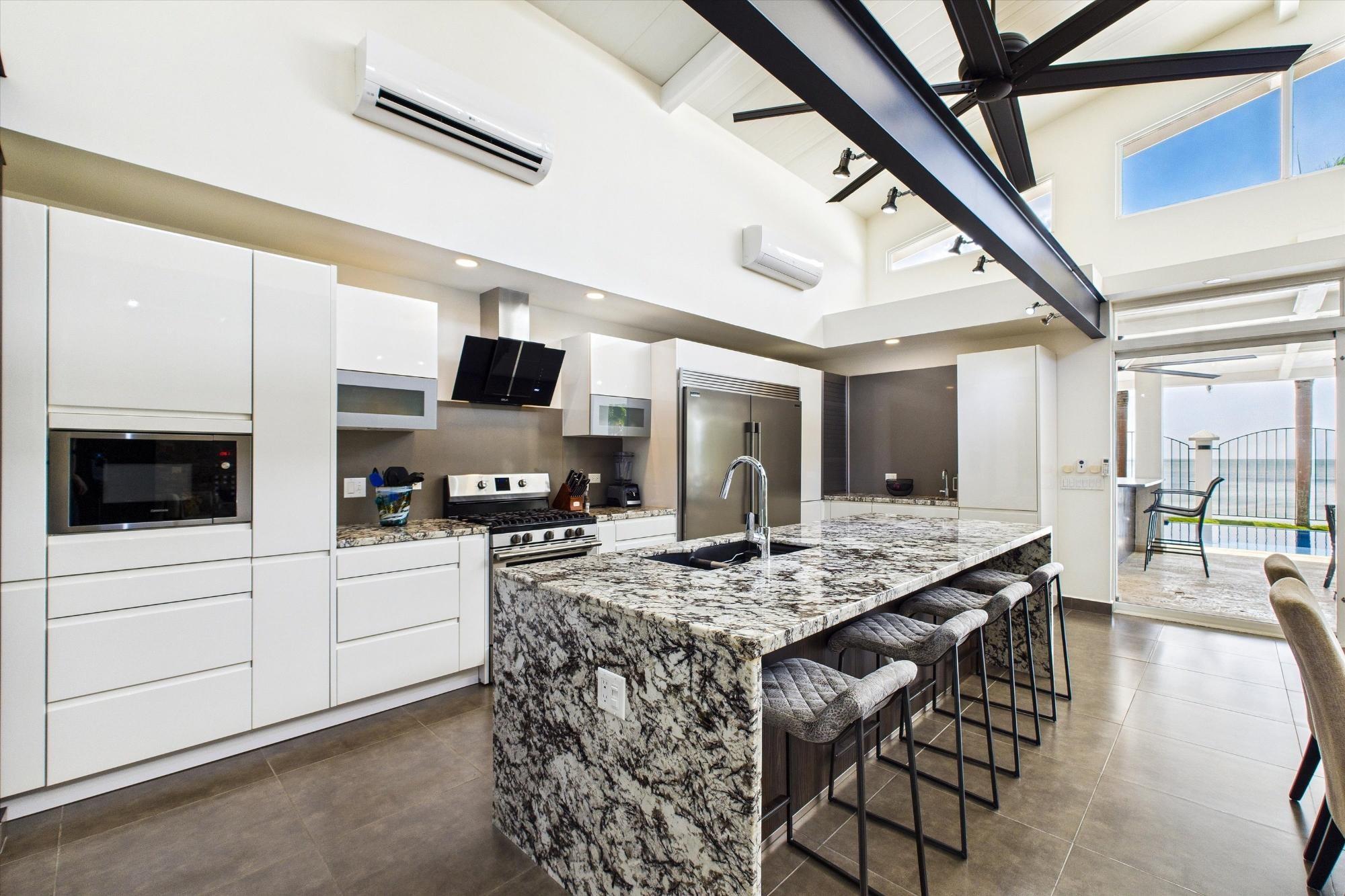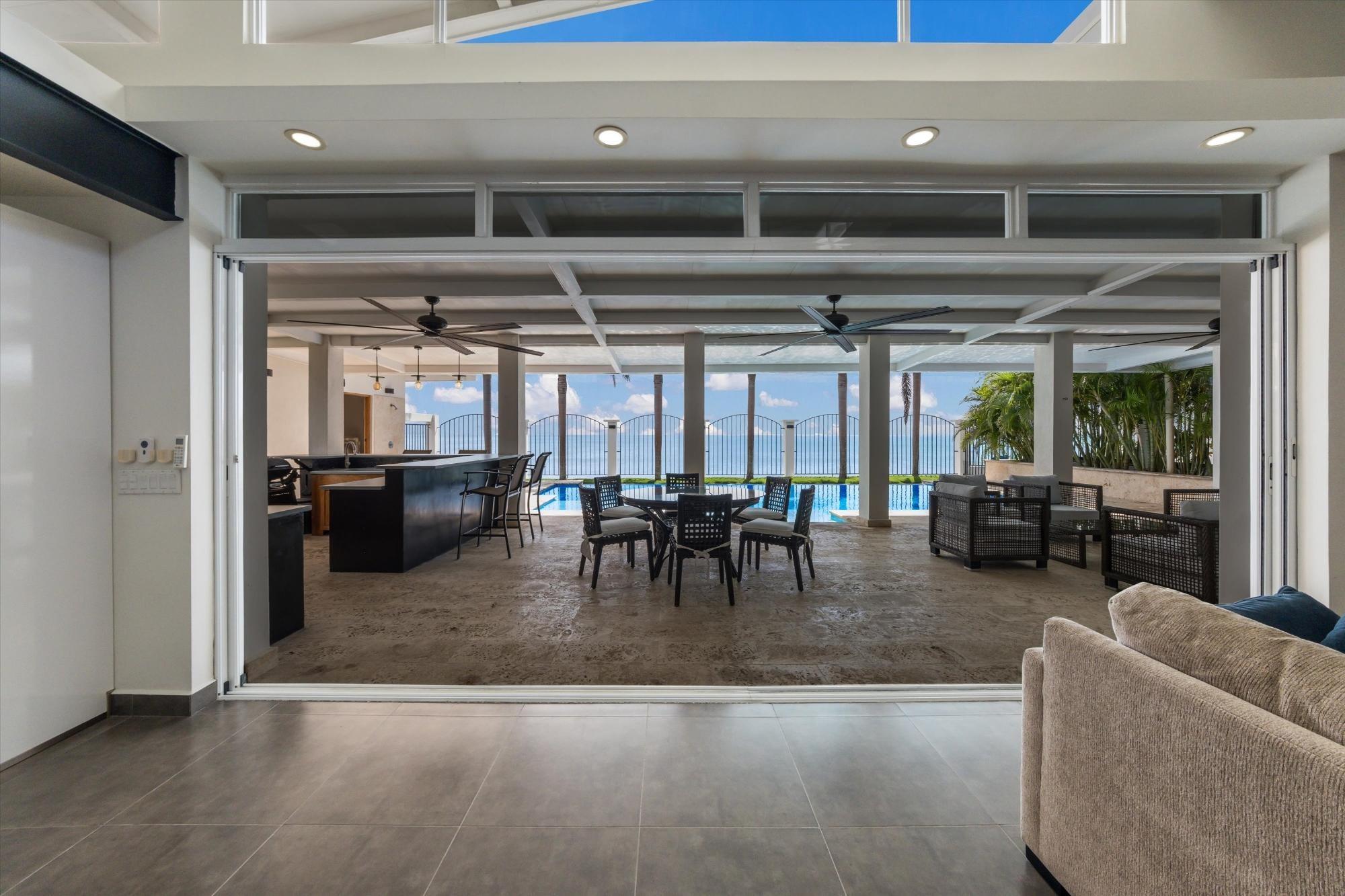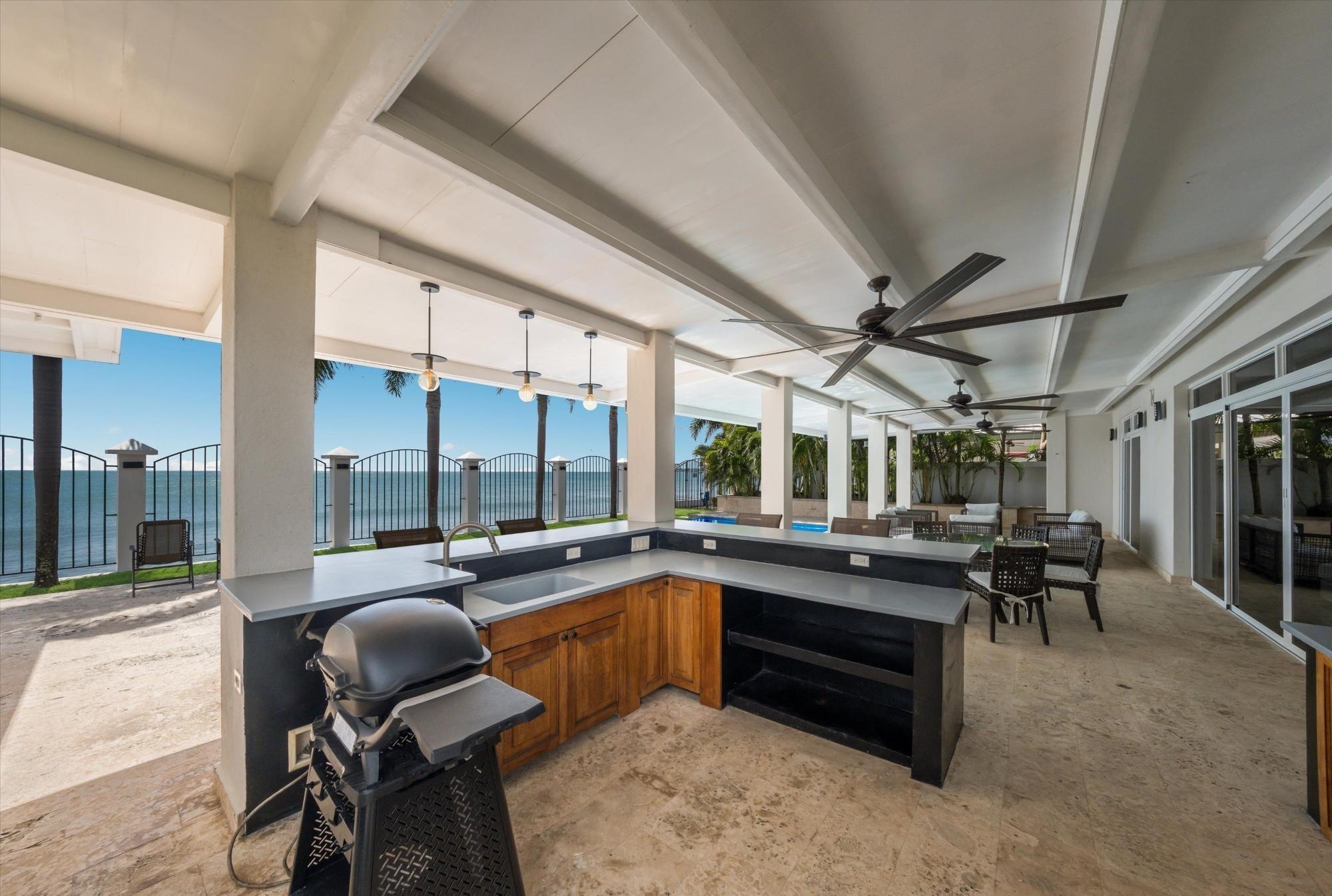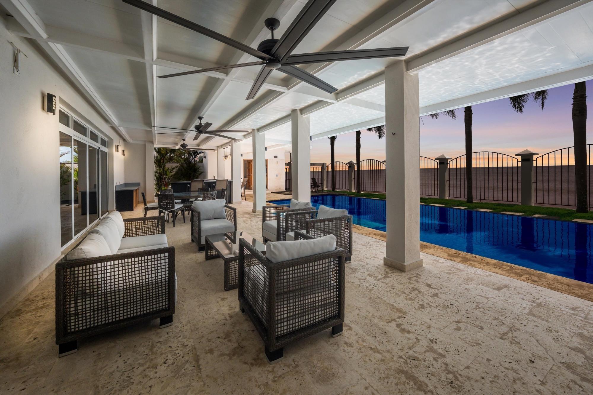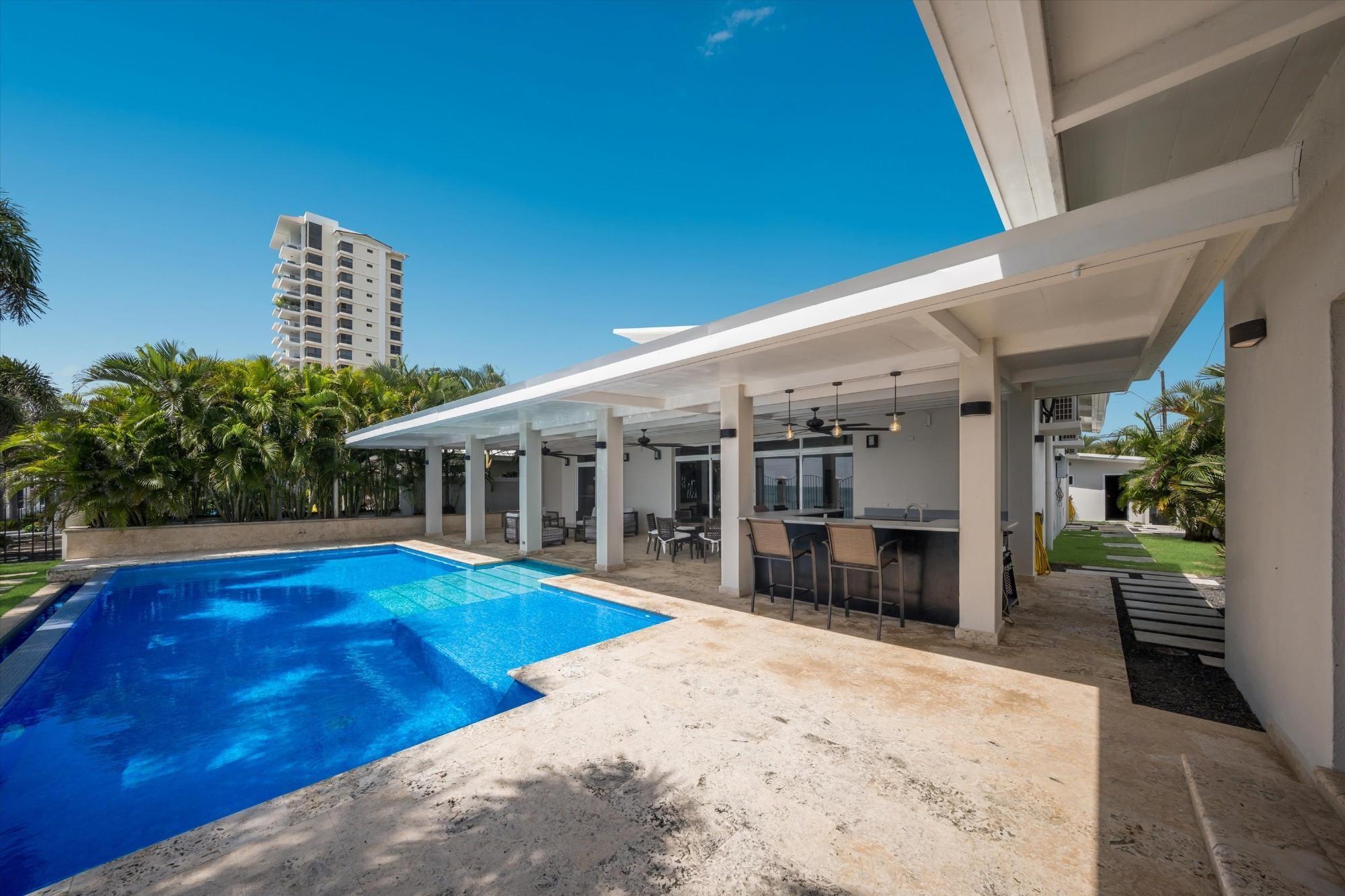 Spectacular oceanfront home in Malibu Beach, Gorgona, situated on a 10,763 sq ft (1,000 sq m) lot with incredible structural upgrades, perimeter walls, an infinity pool, and high-quality finishes throughout. The main residence measures 45' x 47' (approx. 196.5 sq m) and includes three spacious bedrooms, each with its own private bathroom, plus a powder room. The home is delivered fully furnished and equipped with appliances. Enjoy a large covered terrace measuring 19' x 47' (approx. 83 sq m) with a coral stone deck, perfect for relaxing in the ocean breeze. The property features a concrete and tile infinity pool (16' x 36'), along with a cabana with a full bathroom for added comfort and a social area. Among its many upgrades are 7-foot-high perimeter walls. Electric gate and front wall with planter. Concrete breakwater facing the ocean. Enclosed garage with electric doors. Underground irrigation system. 2,400-gallon underground water tanks. Septic tank and complete landscaping. An ideal property for oceanfront living, retirement, Airbnb investment, or enjoying as a beach house in one of the fastest-growing areas of the Pacific Riviera.