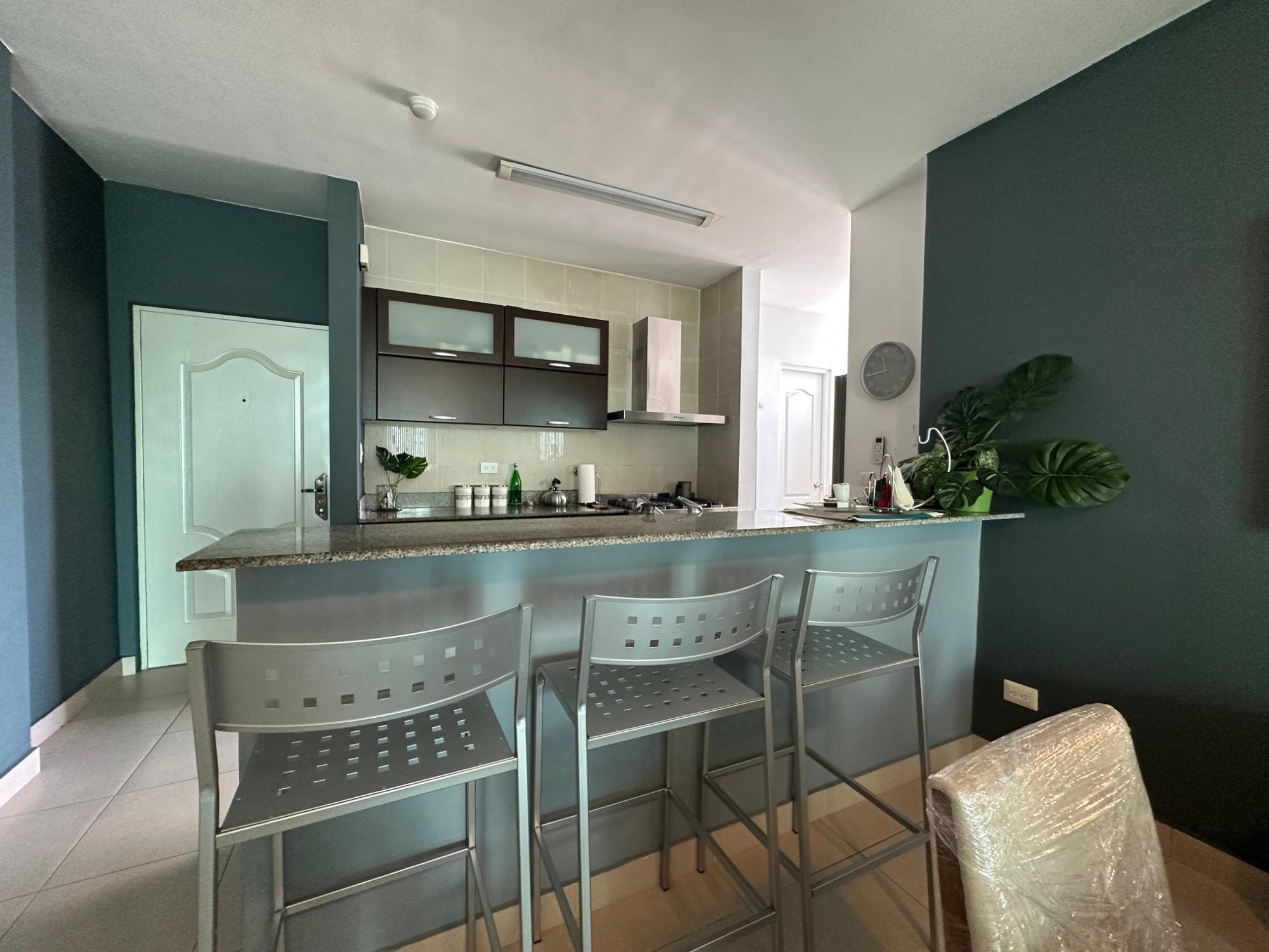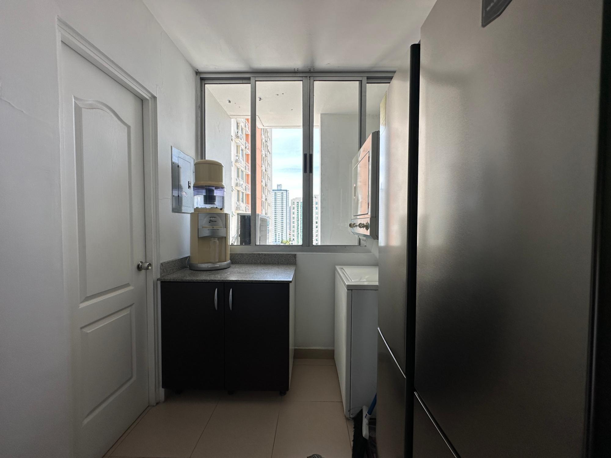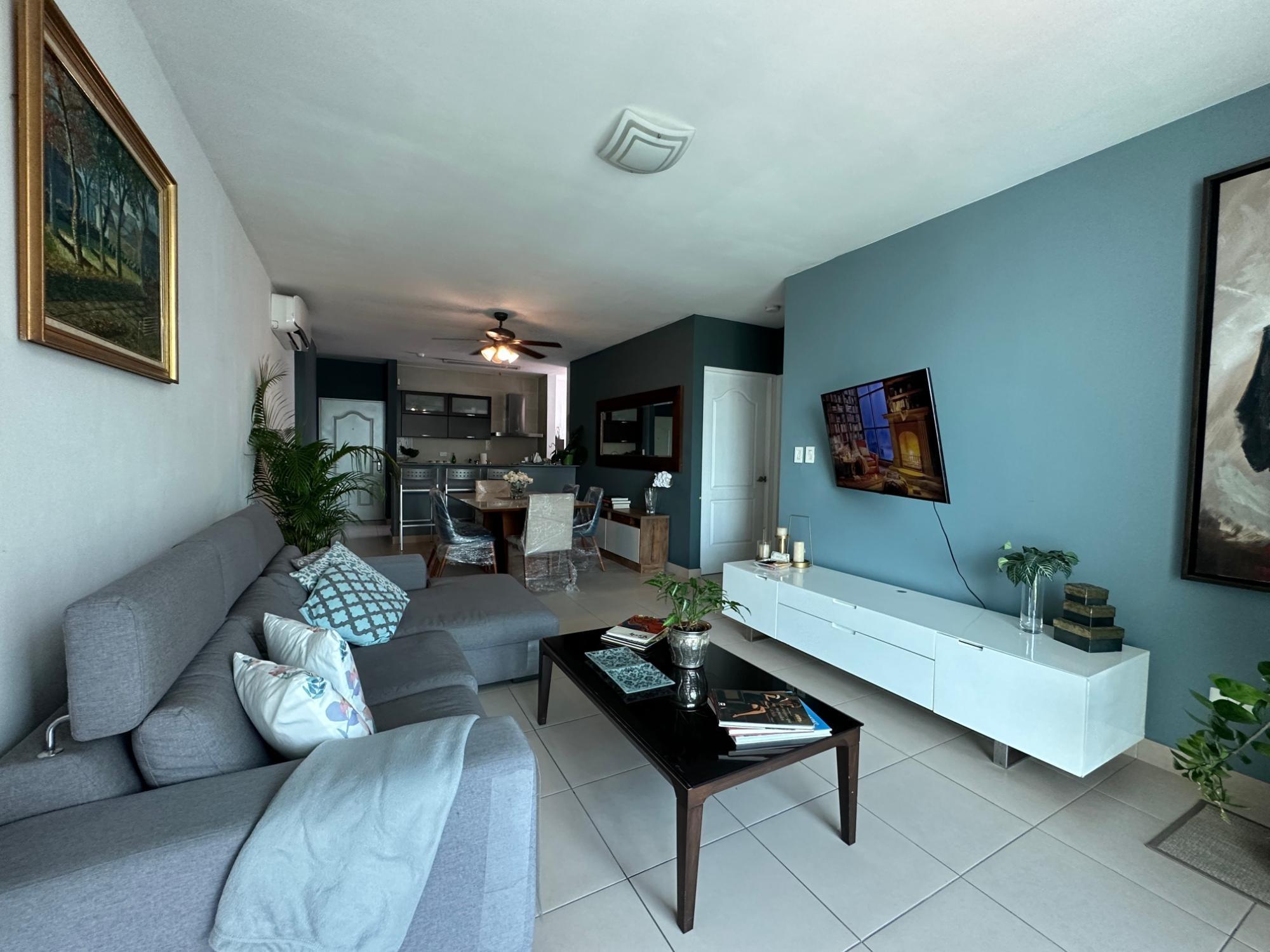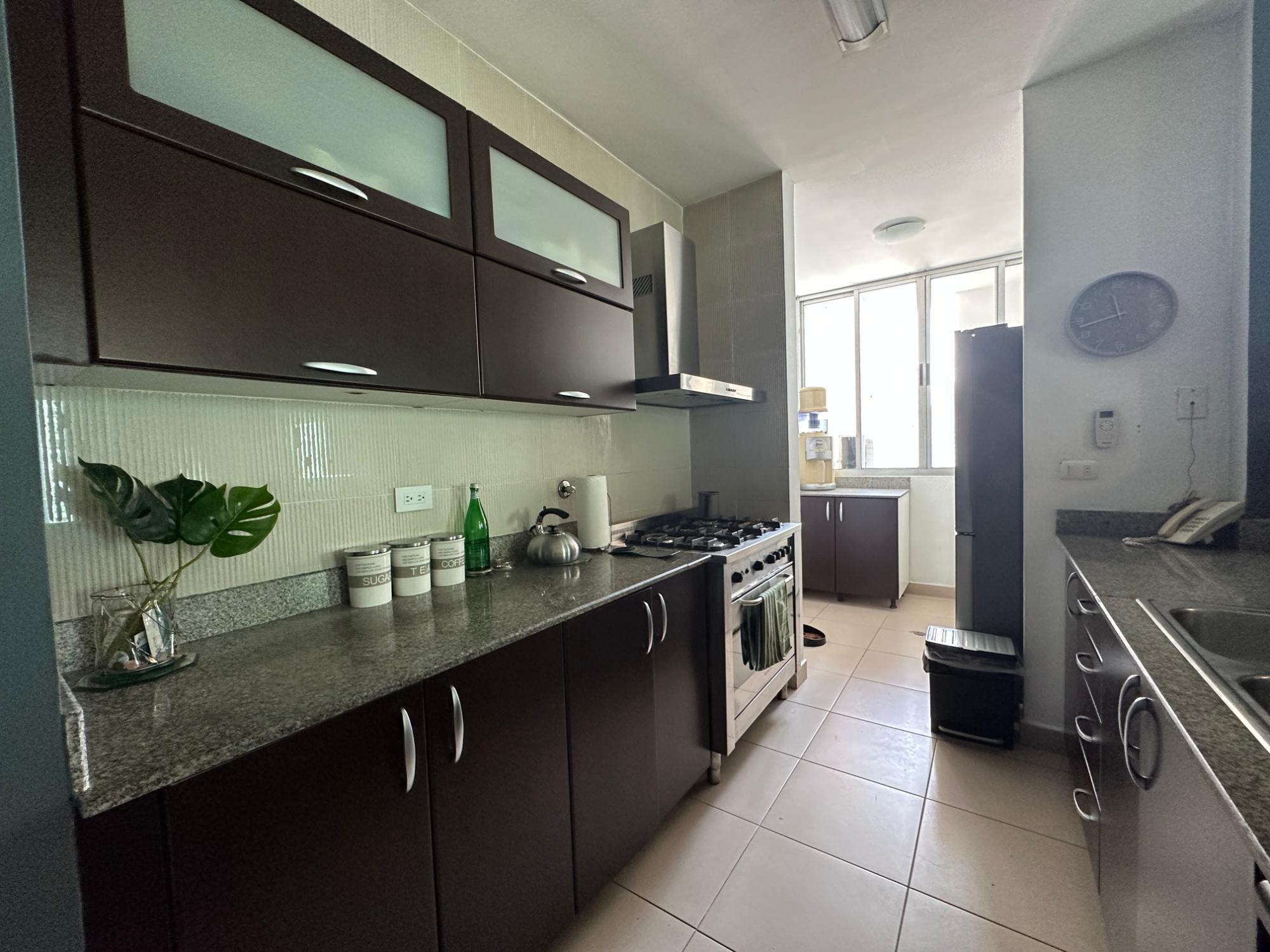 Available for rent in March 2026. Furnished and fully equipped, remodeled, 97 m2, 2 bedrooms, 3 full bathrooms. Master bedroom with ensuite bathroom and double closet. Second bedroom with walk-in closet and desk. Full secondary bathroom. Beautiful city view. Balcony. Living/dining room. Split inverter air conditioners. Open laundry room with service bathroom. Fully equipped integrated kitchen with inverter refrigerator. Blackout curtains in bedrooms. Ceramic tile floors. Open kitchen with complete appliances, including dishwasher. 1 covered parking space. Building with recreational areas including pool, gym, playground, event room, 24/7 security, and visitor parking. Rent: $1400