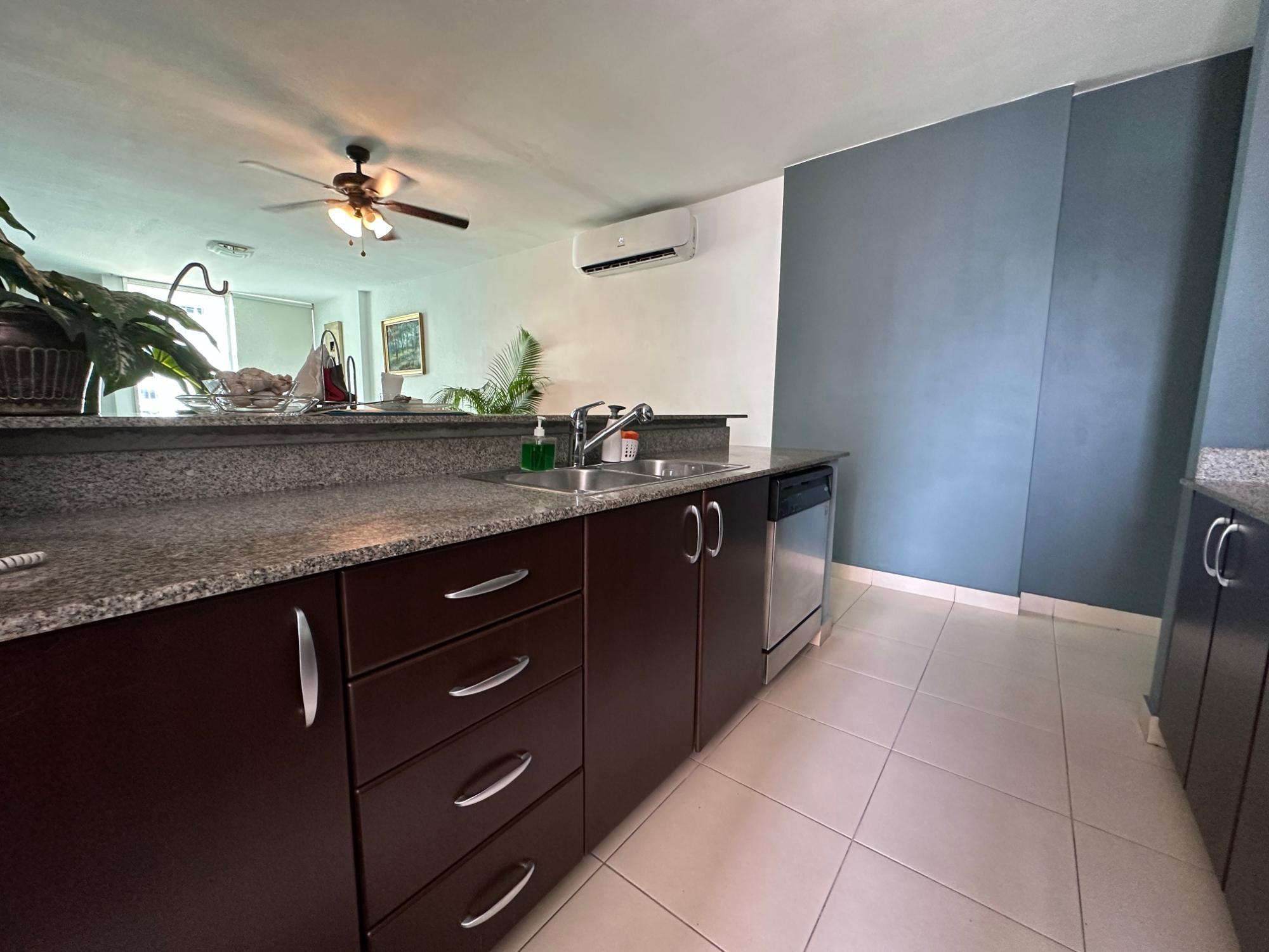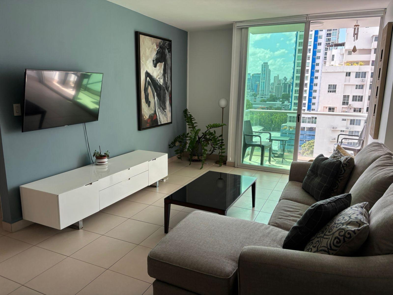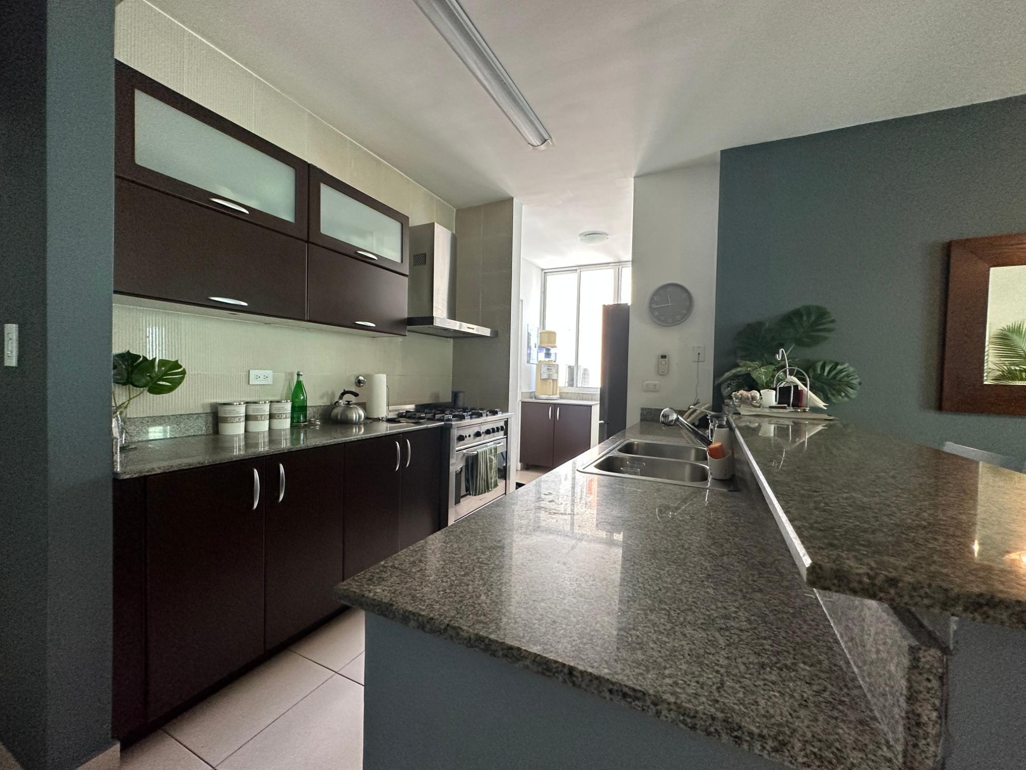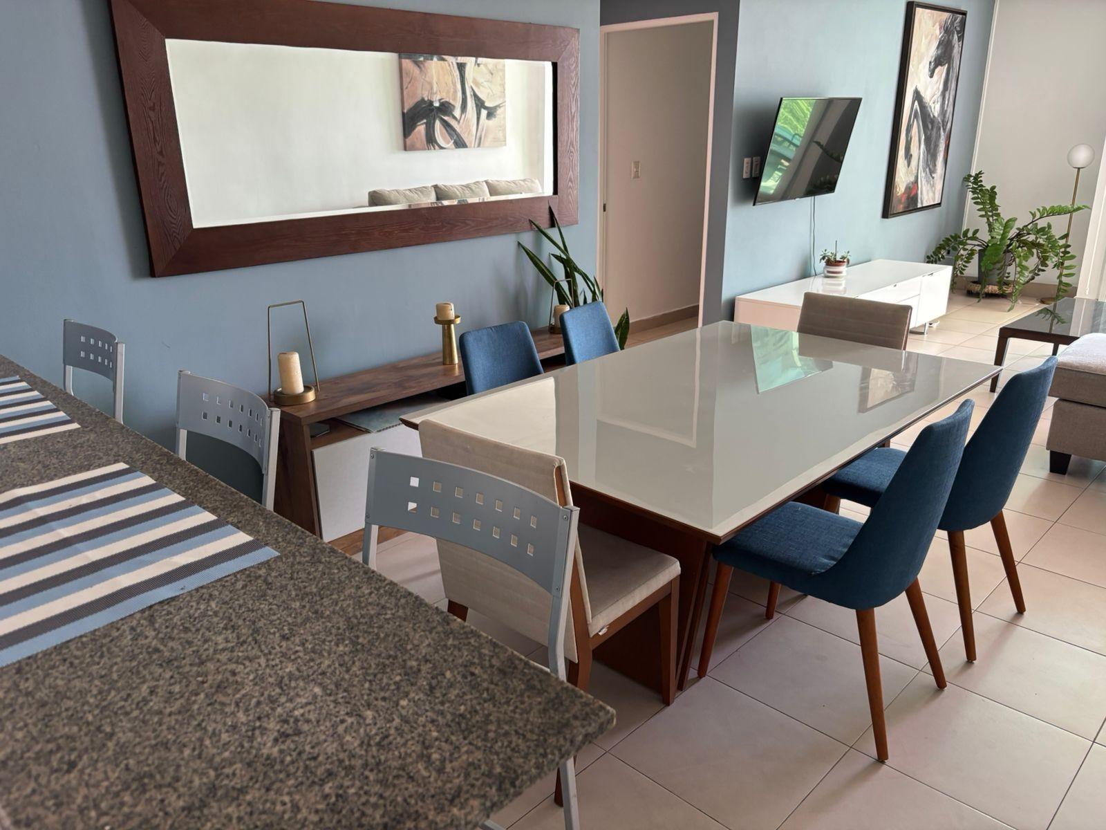 Available for rent in March 2026. Furnished and fully equipped, remodeled, 97 m2, 2 bedrooms, 3 full bathrooms. Master bedroom with ensuite bathroom and double closet. Second bedroom with walk-in closet and desk. Full secondary bathroom. Beautiful city view. Balcony. Living/dining room. Split inverter air conditioners. Open laundry room with service bathroom. Fully equipped integrated kitchen with inverter refrigerator. Blackout curtains in bedrooms. Ceramic tile floors. Open kitchen with complete appliances, including dishwasher. 1 covered parking space. Building with recreational areas including pool, gym, playground, event room, 24/7 security, and visitor parking. Rent: $1400