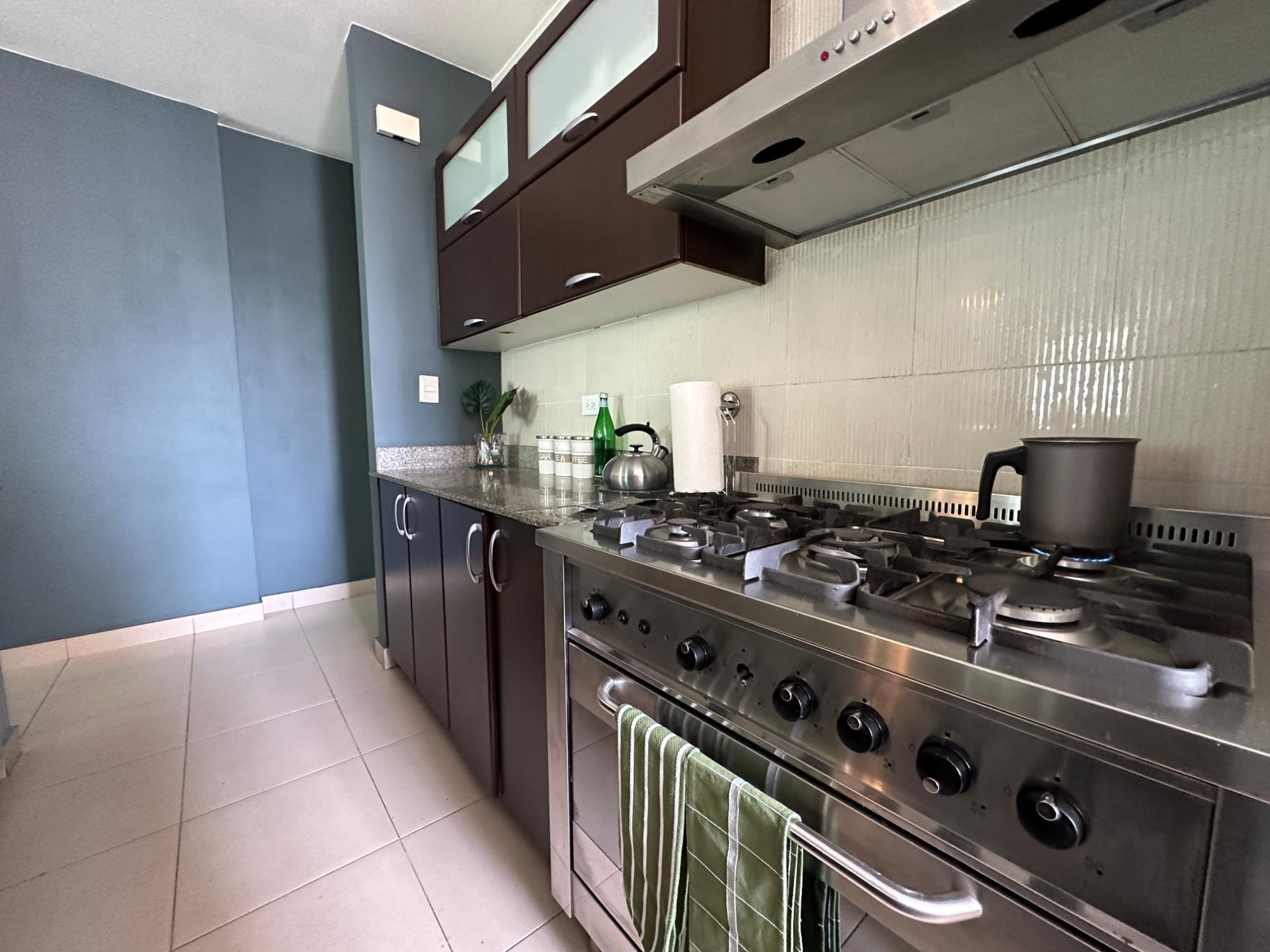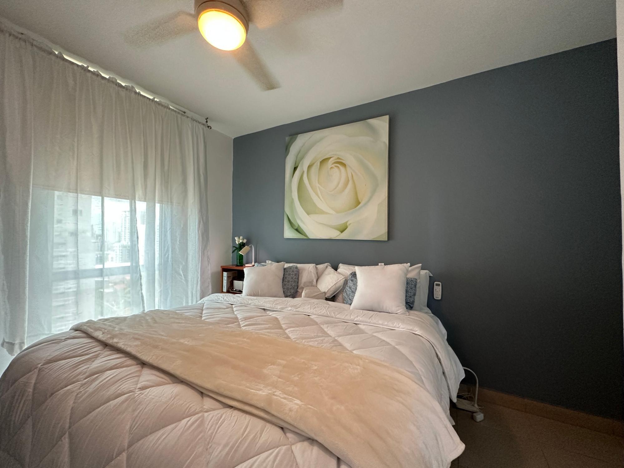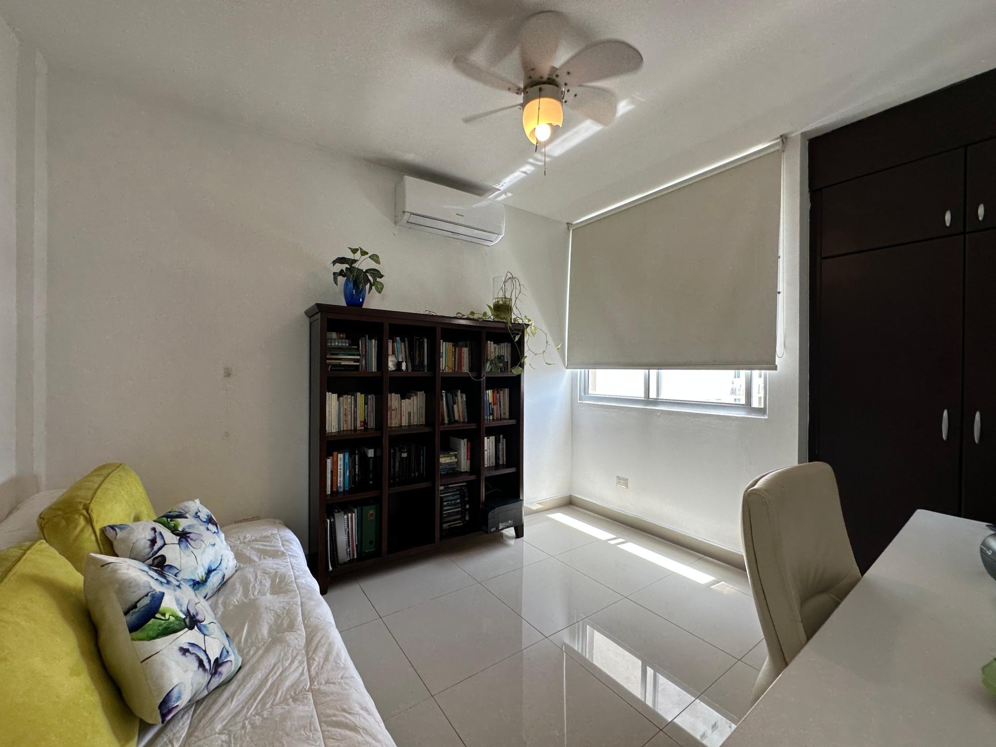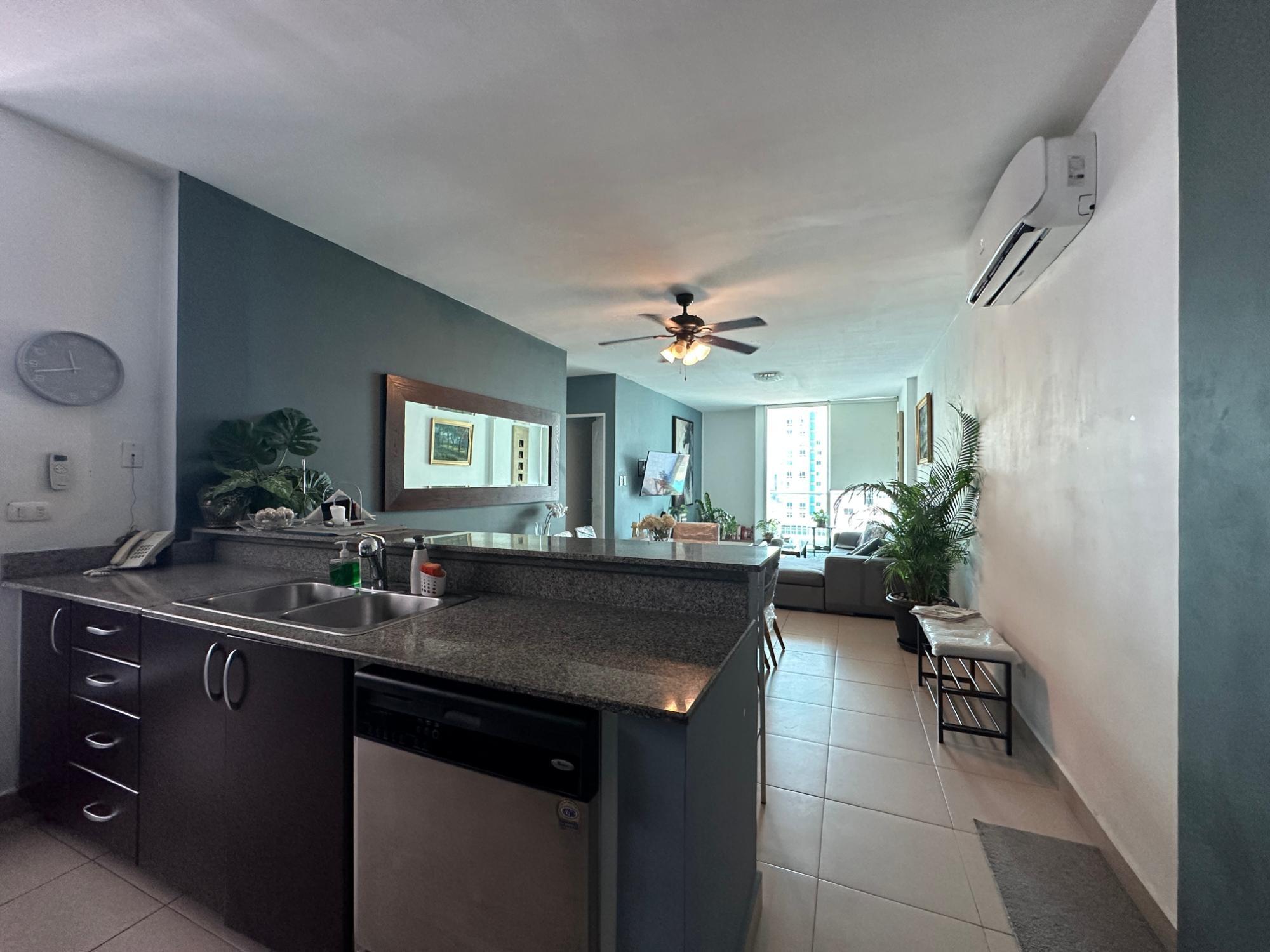 Available for rent in March 2026. Furnished and fully equipped, remodeled, 97 m2, 2 bedrooms, 3 full bathrooms. Master bedroom with ensuite bathroom and double closet. Second bedroom with walk-in closet and desk. Full secondary bathroom. Beautiful city view. Balcony. Living/dining room. Split inverter air conditioners. Open laundry room with service bathroom. Fully equipped integrated kitchen with inverter refrigerator. Blackout curtains in bedrooms. Ceramic tile floors. Open kitchen with complete appliances, including dishwasher. 1 covered parking space. Building with recreational areas including pool, gym, playground, event room, 24/7 security, and visitor parking. Rent: $1400