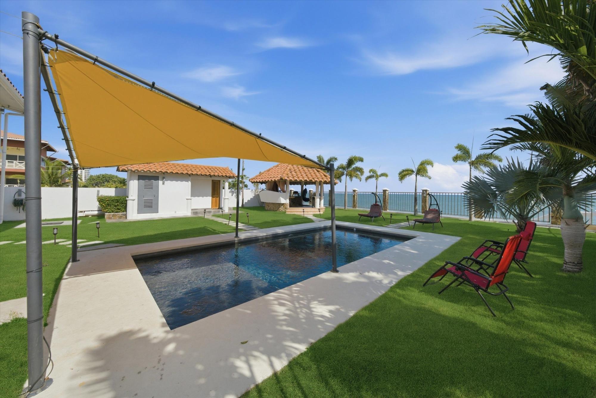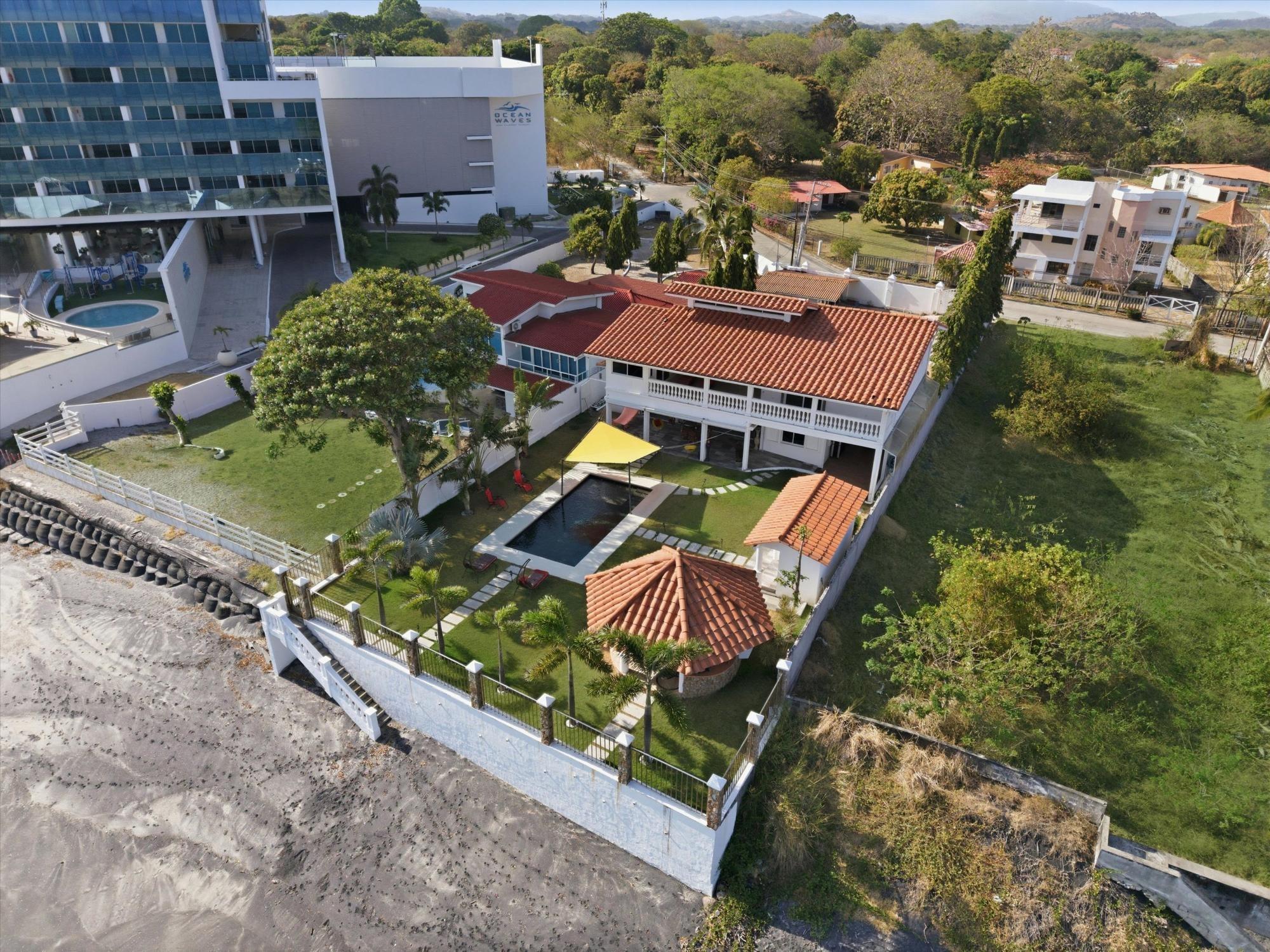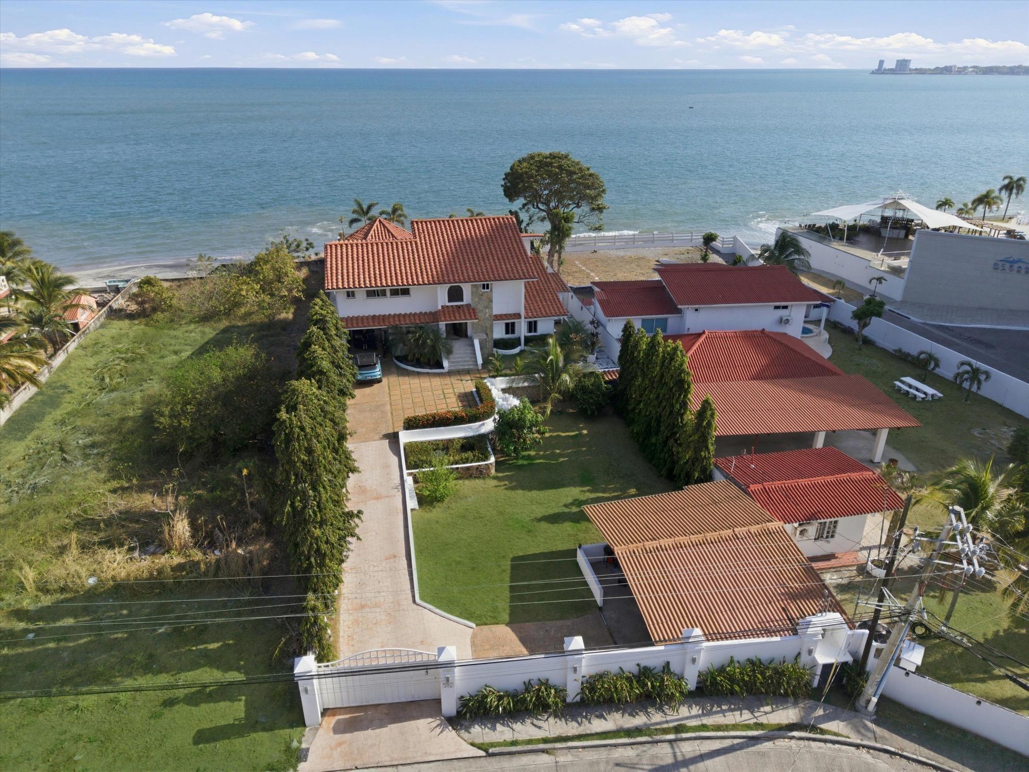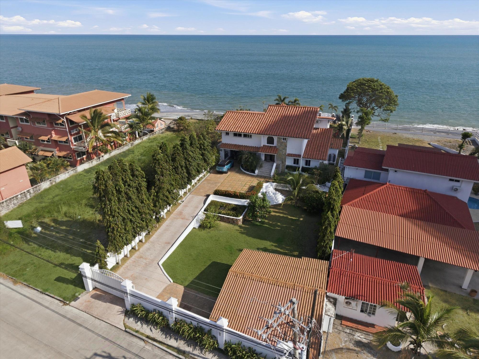 OCEANFRONT ESTATE — PLAYA MALIBU, PANAMA List Price: $950,000 | 5 Bed | 6 Bath + 3 Half | 2-Car Garage | 297 m² Built | 1,250 m² Lot | Built 2018 Set directly on the sand at Playa Malibu, this two-story estate delivers 229 m² of interior living space across two floors, plus a separate circular dining pavilion — all on a fully walled, gated oceanfront lot steps from private beach access. The ground floor opens through folding glass walls to a covered terrace (32 m²), blurring the line between interior and outdoor living. The kitchen features a gas island cooktop, marble countertops, solid hardwood cabinetry, and stainless steel appliances. A solid live-edge dining table anchors the open-plan living and dining area. Two bedrooms and two full baths complete the ground floor. Upstairs, three bedrooms — the largest over 25 m² — share 35.9 m² of ocean-facing balcony space. A dedicated home office with ocean exposure and multiple full and half-baths round out the second floor. Outdoors, a lap pool with shade sails and lounge chairs sits at the center of a manicured lawn. A thatched open-air gazebo with full BBQ kitchen serves as the entertainment hub. A reinforced seawall over 10 meters high protects the entire property. The beach beyond is one of Panama's longest uninterrupted stretches — over 8 km of walkable Pacific shoreline reaching the Chame River. Built in 2018. Fully furnished. Move-in ready. Two-car garage. Caretaker casita on site. At $950,000 — finished construction on direct oceanfront land — this represents a rare opportunity that cannot be replicated at this price point.