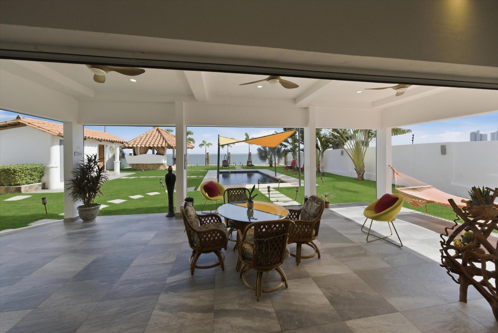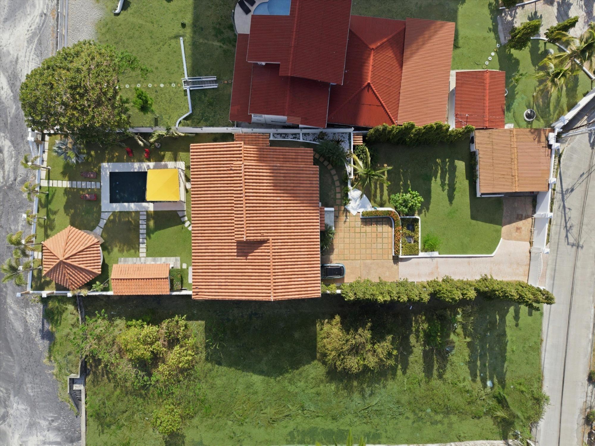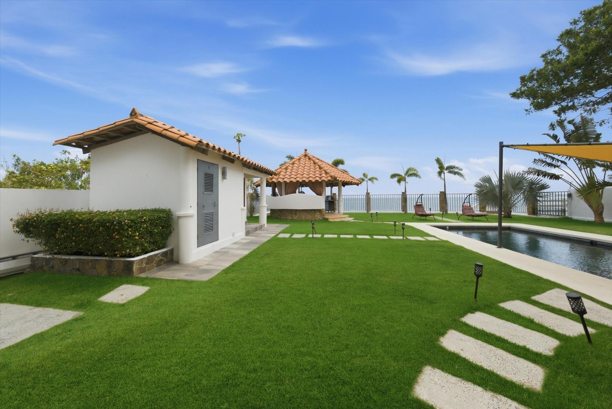 OCEANFRONT ESTATE — PLAYA MALIBU, PANAMA List Price: $950,000 | 5 Bed | 6 Bath + 3 Half | 2-Car Garage | 297 m² Built | 1,250 m² Lot | Built 2018 Set directly on the sand at Playa Malibu, this two-story estate delivers 229 m² of interior living space across two floors, plus a separate circular dining pavilion — all on a fully walled, gated oceanfront lot steps from private beach access. The ground floor opens through folding glass walls to a covered terrace (32 m²), blurring the line between interior and outdoor living. The kitchen features a gas island cooktop, marble countertops, solid hardwood cabinetry, and stainless steel appliances. A solid live-edge dining table anchors the open-plan living and dining area. Two bedrooms and two full baths complete the ground floor. Upstairs, three bedrooms — the largest over 25 m² — share 35.9 m² of ocean-facing balcony space. A dedicated home office with ocean exposure and multiple full and half-baths round out the second floor. Outdoors, a lap pool with shade sails and lounge chairs sits at the center of a manicured lawn. A thatched open-air gazebo with full BBQ kitchen serves as the entertainment hub. A reinforced seawall over 10 meters high protects the entire property. The beach beyond is one of Panama's longest uninterrupted stretches — over 8 km of walkable Pacific shoreline reaching the Chame River. Built in 2018. Fully furnished. Move-in ready. Two-car garage. Caretaker casita on site. At $950,000 — finished construction on direct oceanfront land — this represents a rare opportunity that cannot be replicated at this price point.