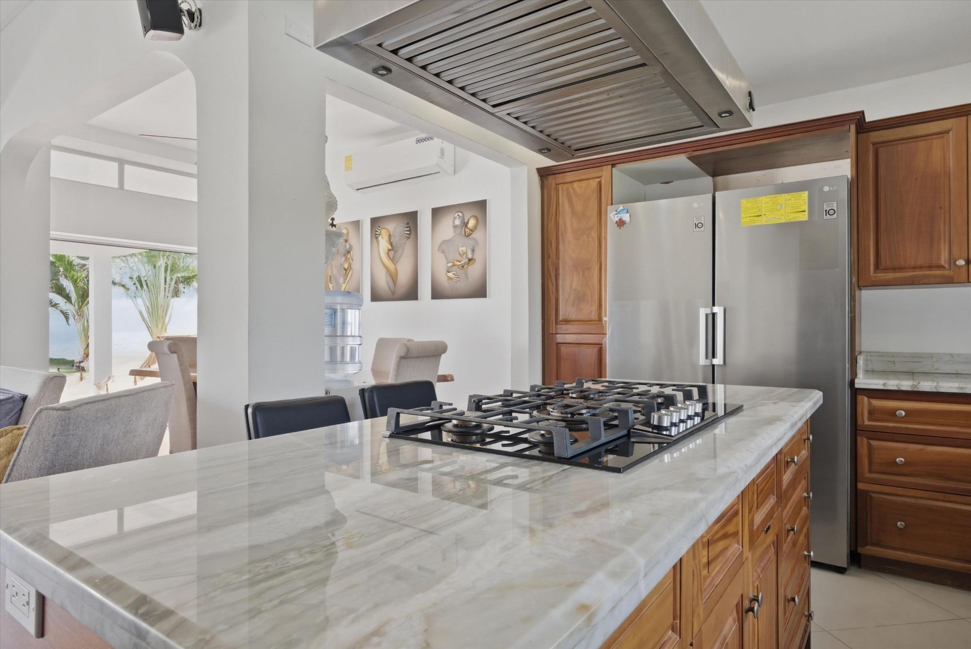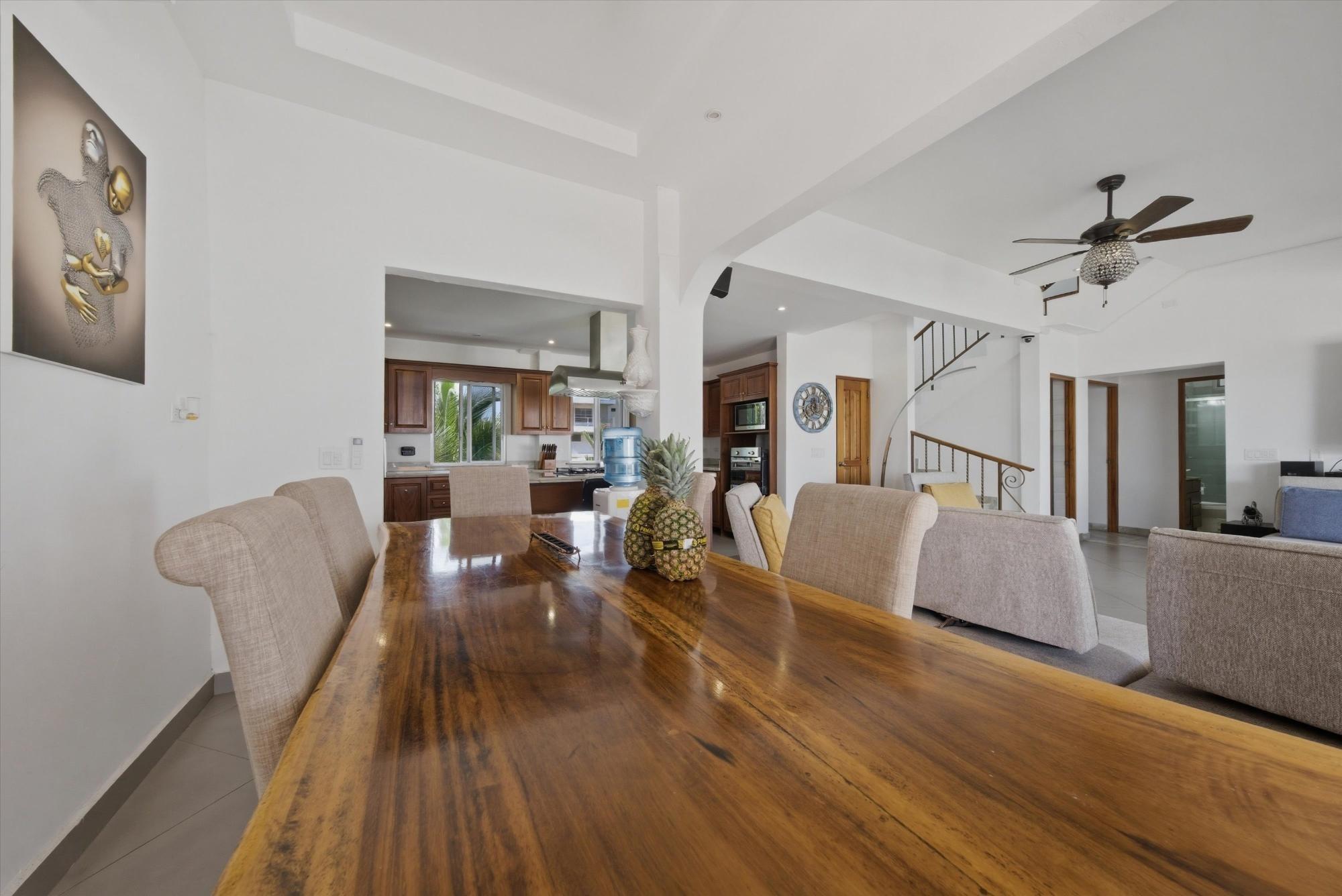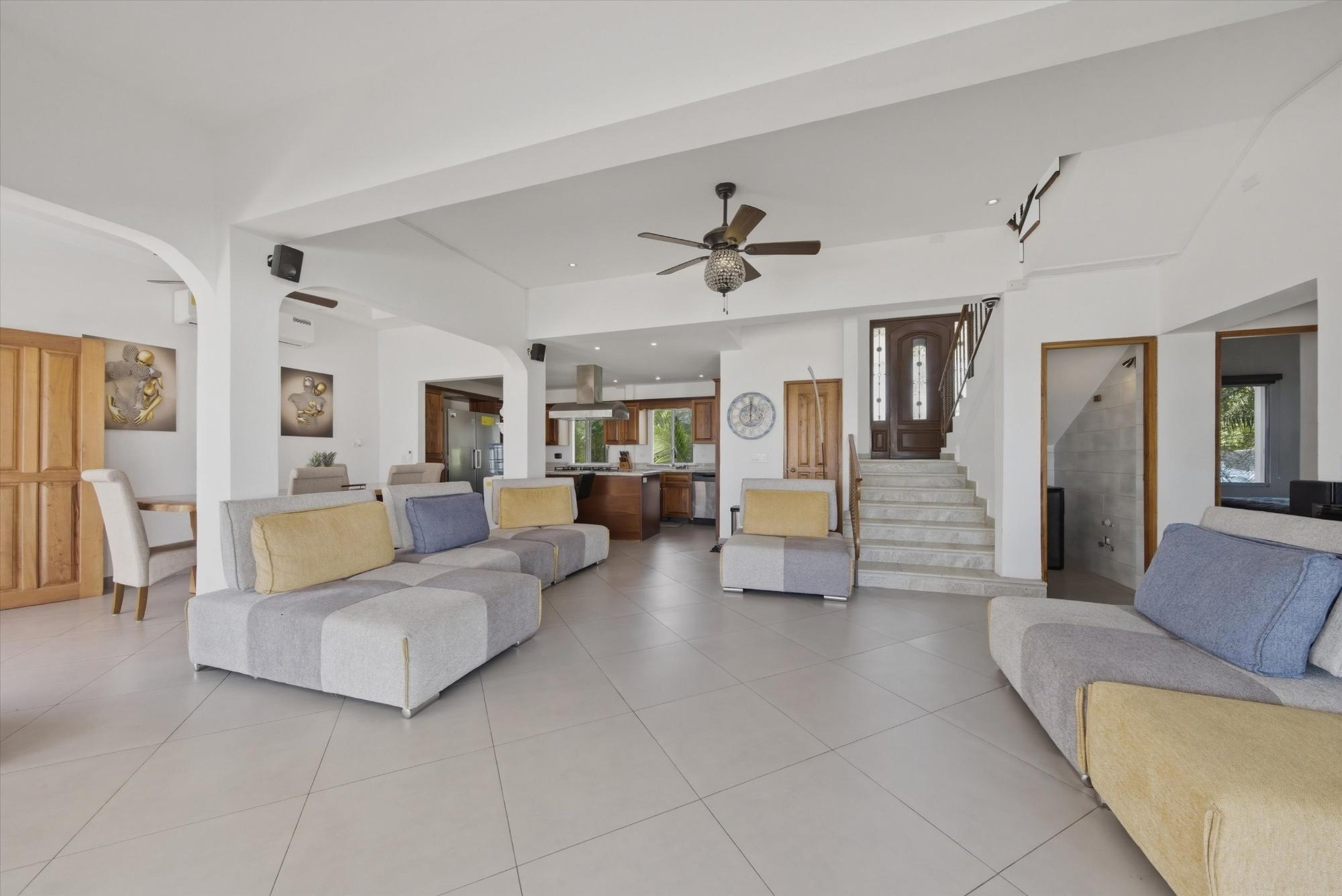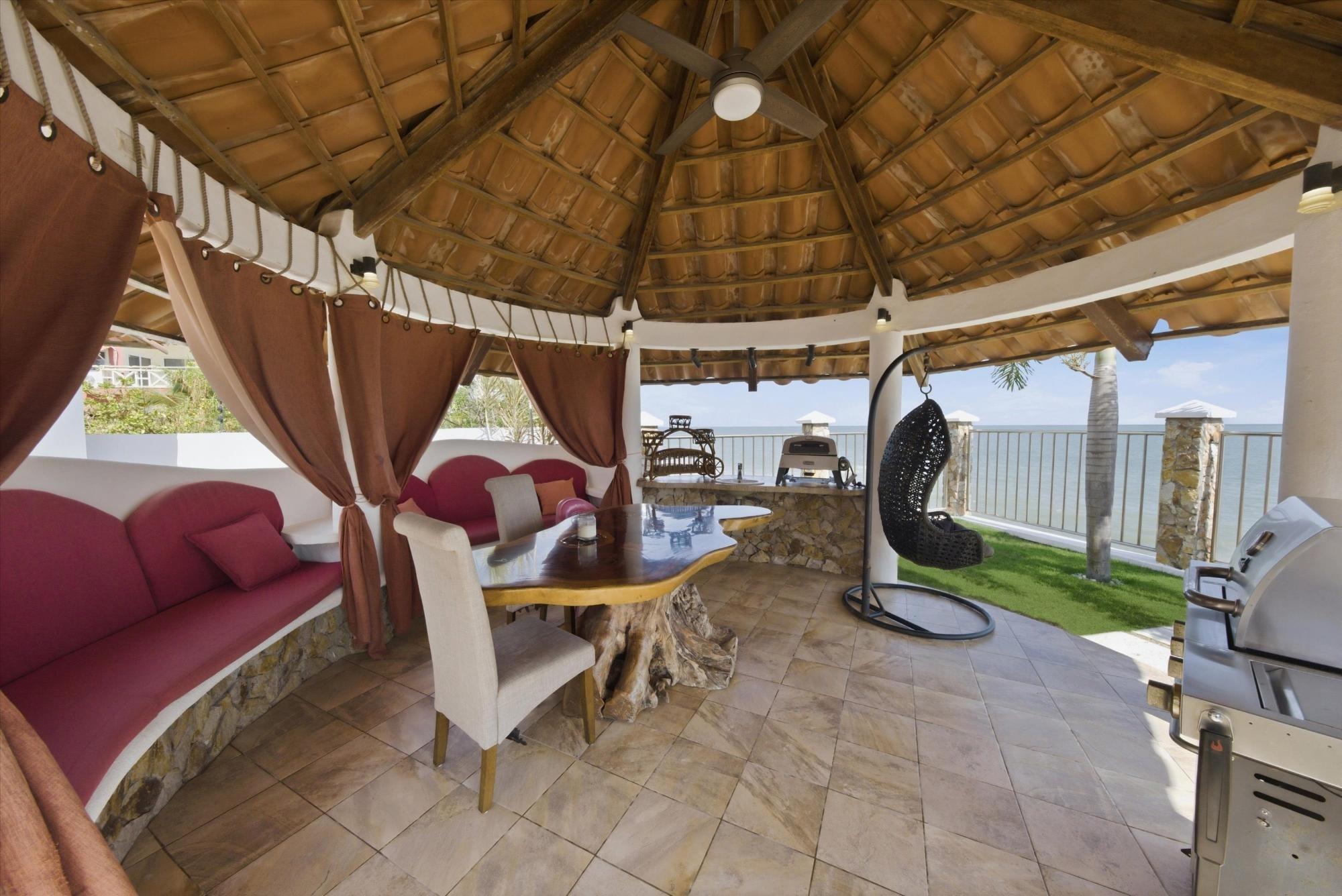 OCEANFRONT ESTATE — PLAYA MALIBU, PANAMA List Price: $950,000 | 5 Bed | 6 Bath + 3 Half | 2-Car Garage | 297 m² Built | 1,250 m² Lot | Built 2018 Set directly on the sand at Playa Malibu, this two-story estate delivers 229 m² of interior living space across two floors, plus a separate circular dining pavilion — all on a fully walled, gated oceanfront lot steps from private beach access. The ground floor opens through folding glass walls to a covered terrace (32 m²), blurring the line between interior and outdoor living. The kitchen features a gas island cooktop, marble countertops, solid hardwood cabinetry, and stainless steel appliances. A solid live-edge dining table anchors the open-plan living and dining area. Two bedrooms and two full baths complete the ground floor. Upstairs, three bedrooms — the largest over 25 m² — share 35.9 m² of ocean-facing balcony space. A dedicated home office with ocean exposure and multiple full and half-baths round out the second floor. Outdoors, a lap pool with shade sails and lounge chairs sits at the center of a manicured lawn. A thatched open-air gazebo with full BBQ kitchen serves as the entertainment hub. A reinforced seawall over 10 meters high protects the entire property. The beach beyond is one of Panama's longest uninterrupted stretches — over 8 km of walkable Pacific shoreline reaching the Chame River. Built in 2018. Fully furnished. Move-in ready. Two-car garage. Caretaker casita on site. At $950,000 — finished construction on direct oceanfront land — this represents a rare opportunity that cannot be replicated at this price point.