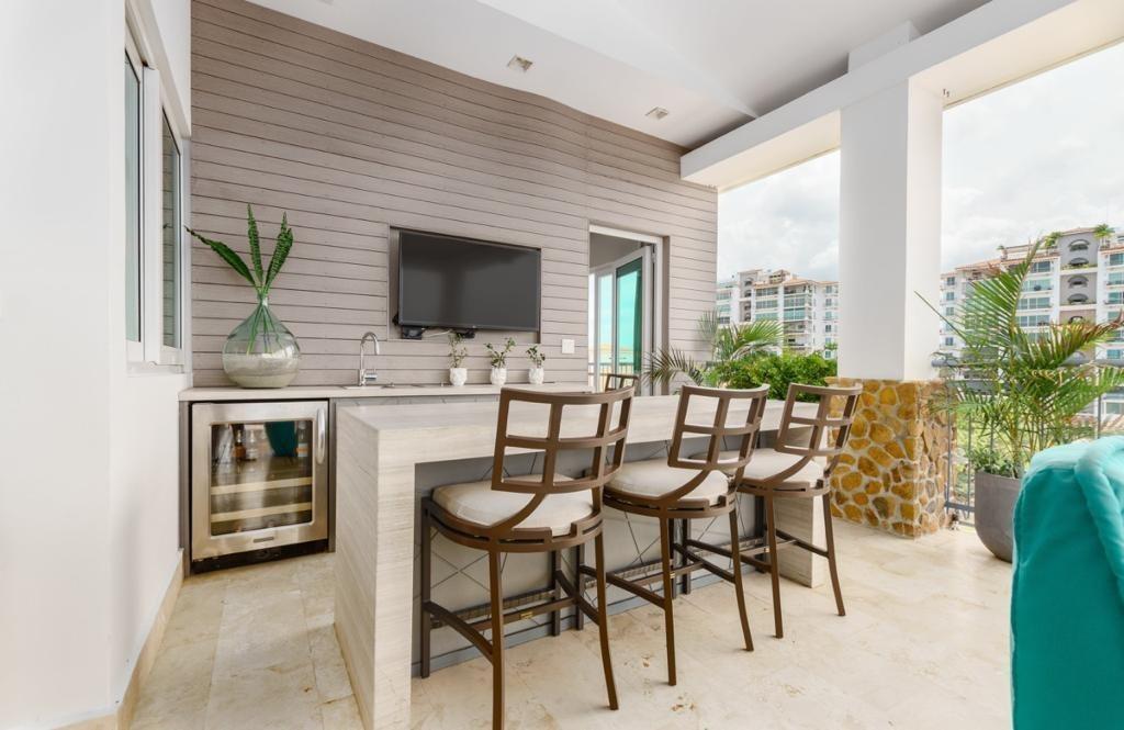Apartamento Lujo en Punta Barco Village4 recámaras • 4 baños • 4 garajes privadosCocina italiana con sobres de marmolina y fregadero doble de acero inoxidableBaños revestidos en mármol hasta el techo, con lavamanos decorativos y puertas de vidrio templadoVestidor en la recámara principal con maleteros, gavetas y barra colgaderaTerraza abierta, balcón, den y lavandería independientePuerta principal de madera maciza con cerradura de seguridadEscaleras en mármol, cielorrasos en gypsum con molduras decorativas