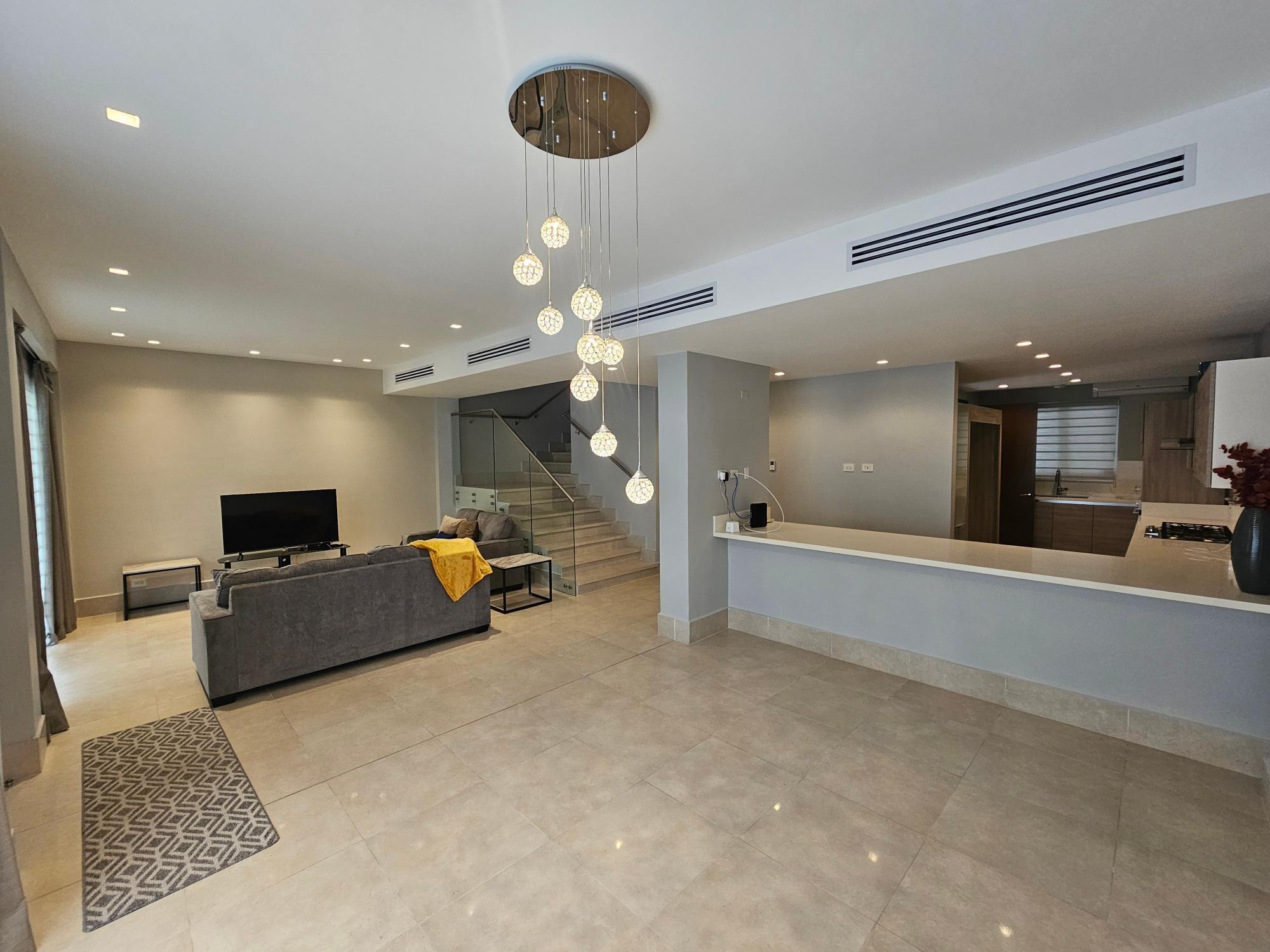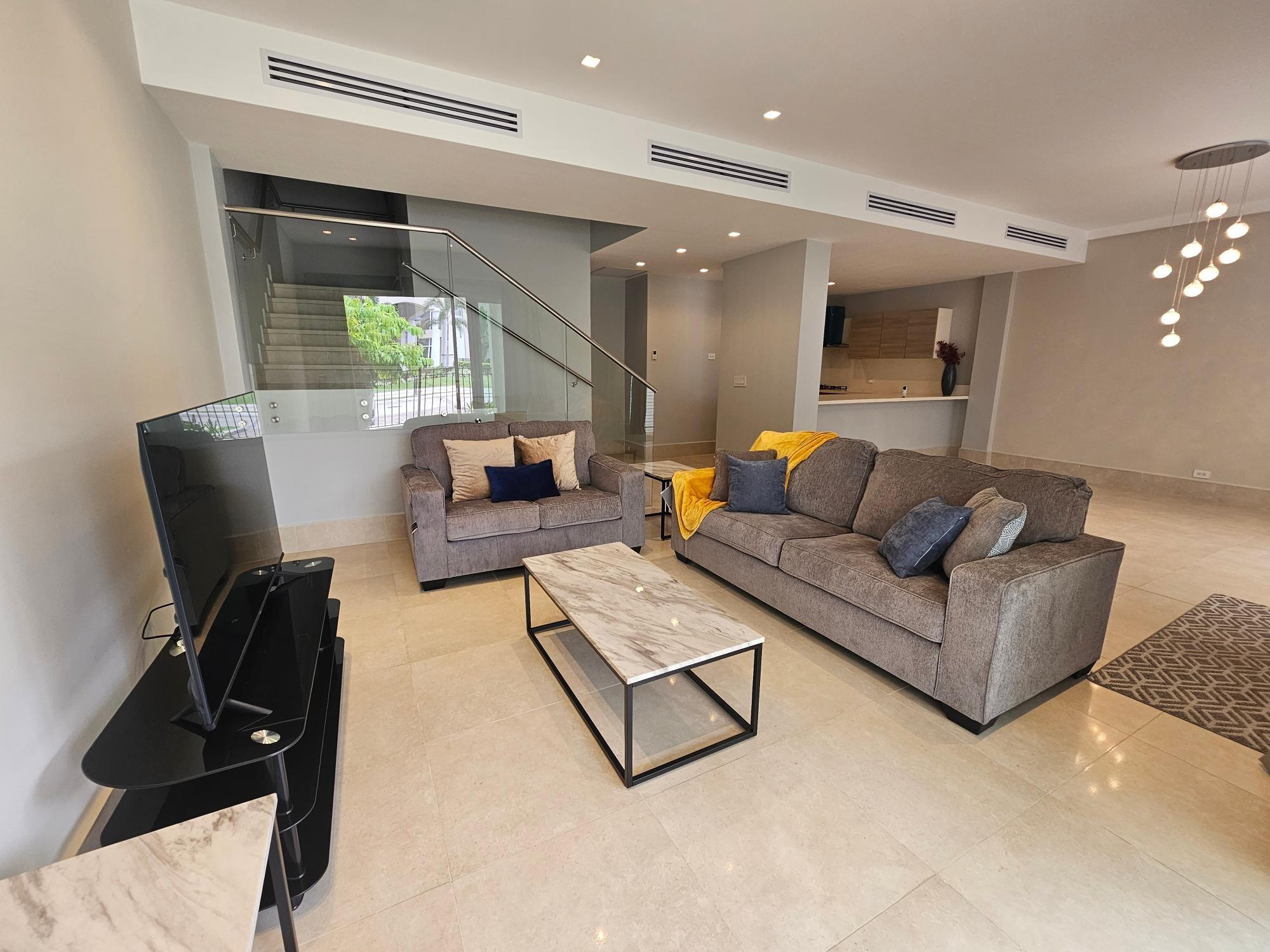 Casa adosada de lujo en alquiler en Santa María, Panamá. Disfrute del estilo de vida definitivo en Santa María, Panamá, la comunidad más prestigiosa de la ciudad, donde la elegancia, la comodidad y el diseño moderno se unen. Esta impresionante casa adosada de 318 m² ofrece pisos de mármol, electrodomésticos de alta gama y acabados de lujo en toda la propiedad. Cada espacio está diseñado con atención al detalle, combinando sofisticación y funcionalidad. La planta principal cuenta con una cocina de concepto abierto, amplias salas de estar y comedor, y un baño de visitas, ideal para recibir invitados. En la planta superior, tres amplias habitaciones incluyen cada una un baño en suite, brindando privacidad y comodidad para cada miembro de la familia. El tercer piso presenta un espacio abierto con un baño completo que puede servir fácilmente como una cuarta habitación, suite para invitados, oficina en casa o sala multimedia. Un garaje para dos autos completa esta excepcional residencia. Los residentes disfrutan de acceso a servicios de primer nivel, que incluyen un área social estilo playa, un gimnasio de última generación, canchas de tenis y baloncesto, y hermosos espacios recreativos ajardinados. Disponible amueblada o sin amueblar, esta es la mejor casa adosada modelo en alquiler en Santa María. Su ubicación privilegiada ofrece cercanía a las mejores escuelas, centros comerciales, supermercados, farmacias y mucho más. Disfrute de una vida refinada donde el lujo se une a la comodidad en Santa María, Panamá. Programe su visita privada hoy mismo.