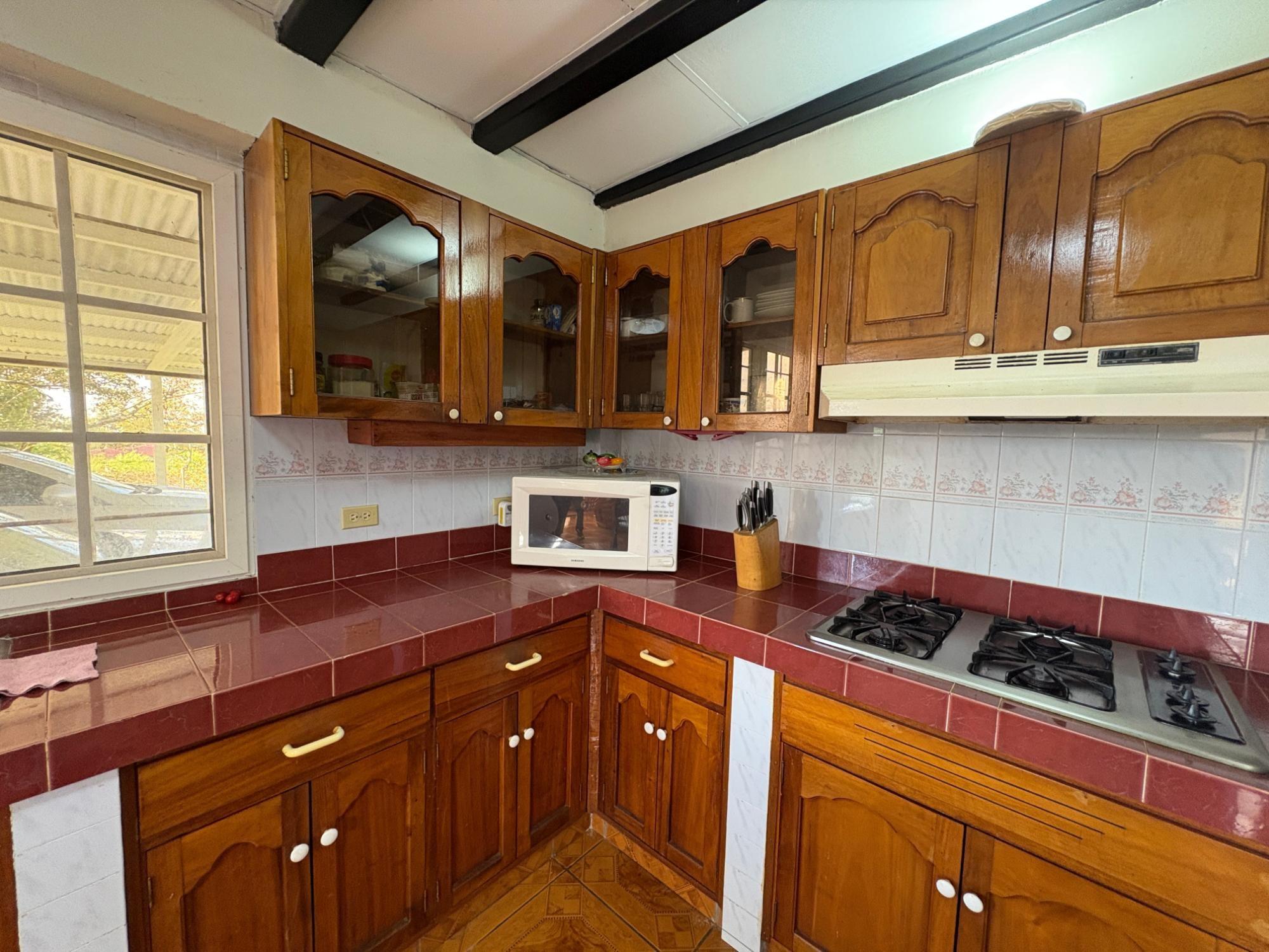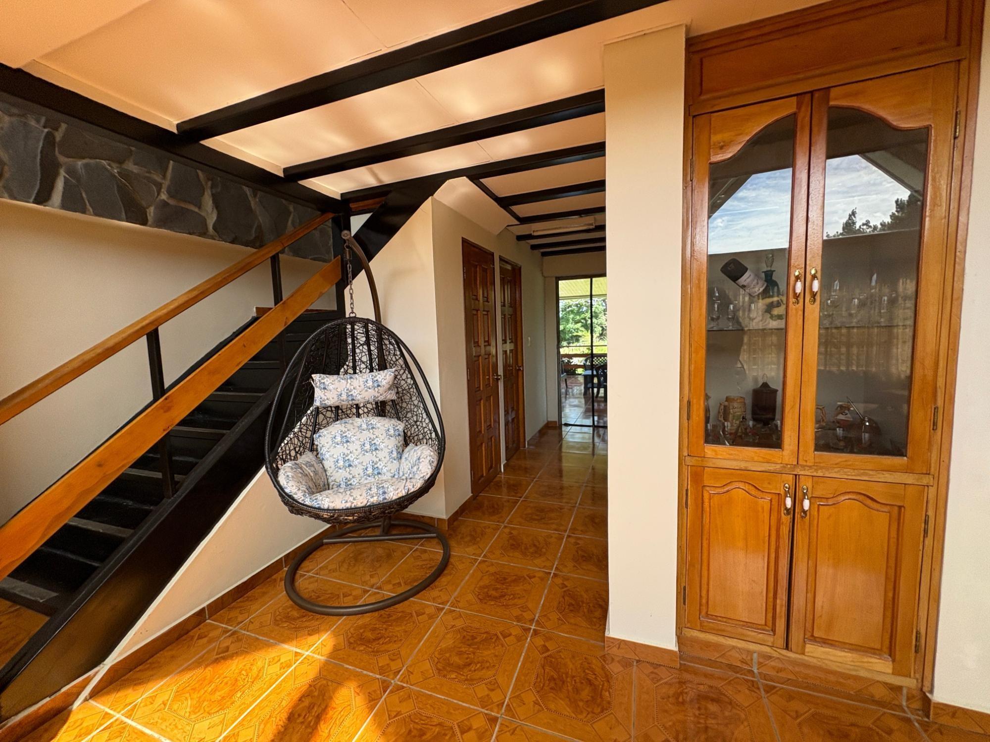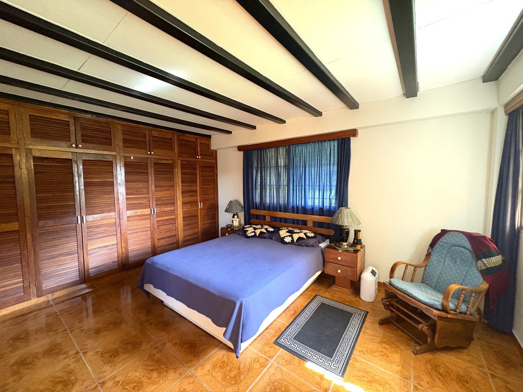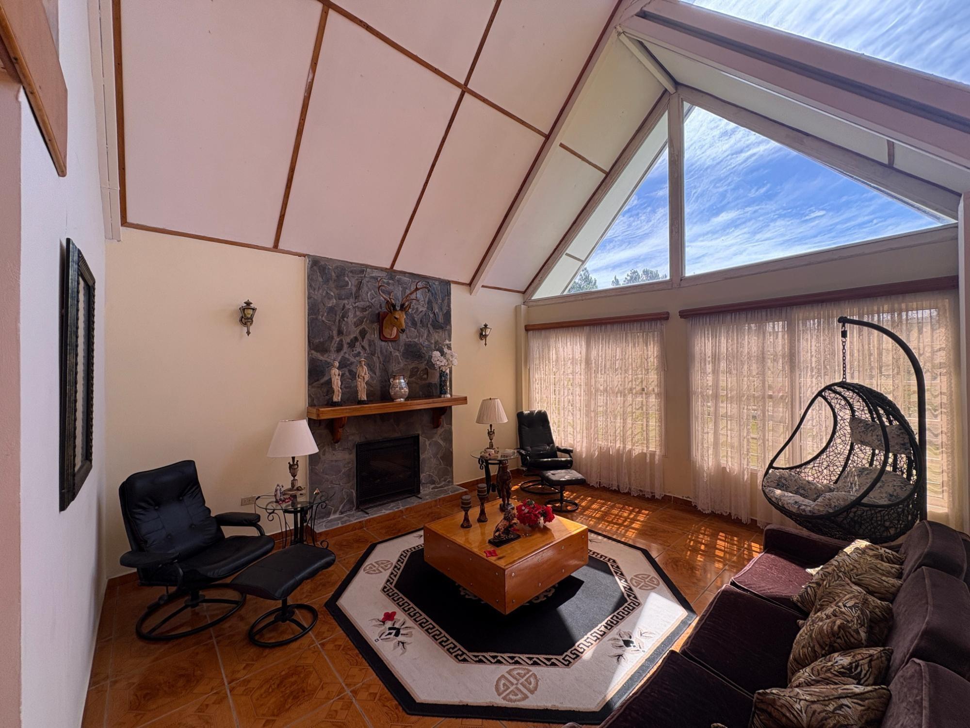 Esta propiedad en Alto Dorado, Alto Boquete, se encuentra en un terreno plano de 4,115 m² y está completamente cercada. Ubicada a solo 12 minutos del centro de Boquete, la casa ofrece privacidad, espacio y un entorno pintoresco con vistas a las montañas. Construcción sólida e interior luminoso. La casa principal cuenta con 3 dormitorios y 3 baños. La casa presenta una distribución espaciosa con altos techos abovedados en la sala de estar, gracias a su diseño de techo a dos aguas, que realza la sensación de espacio y luz. Grandes ventanales ofrecen vistas a las montañas y crean un ambiente tranquilo en toda la casa. Las áreas abiertas de sala de estar y comedor añaden calidez y carácter al espacio. Cocina e inclusiones: La cocina es espaciosa, con gabinetes de madera y encimeras de azulejos rojos. La propiedad se vende con electrodomésticos principales, que incluyen refrigerador, estufa y lavadora. Terraza cubierta y disfrute al aire libre: Una terraza cubierta ofrece un espacio cómodo para disfrutar del clima de Boquete. Este espacio es ideal para comidas informales o para pasar tiempo al aire libre con vistas a los jardines, árboles y patio de la propiedad. Terreno productivo con árboles frutales y arroyo estacional. El lote incluye una variedad de árboles frutales, como anacardos (marañón curazao), durazneros y perales jóvenes, y un arroyo estacional que atraviesa la parte trasera de la propiedad. El terreno está bien mantenido, es abierto y apto para jardinería, plantaciones adicionales o incluso para futuras construcciones. Estacionamiento y acceso: Hay una cochera cubierta con espacio para dos vehículos y una amplia entrada. La casa se encuentra en una calle tranquila dentro de una zona residencial de Alto Dorado, con fácil acceso a la carretera principal que lleva al pueblo.